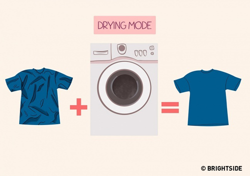 Chế độ sấy khô có thể “là phẳng” quần áo bằng cotton hoặc vải lanh. Chọn chế độ trong thời gian ngắn, khoảng 15 phút là đủ. Nếu nếp nhăn lớn thì có thể cho thêm những thứ nhỏ hơn như tất, áo font trẻ em hoặc một chiếc khăn tay vào máy giặt.