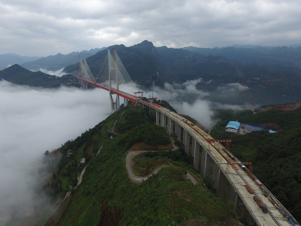Cầu dài 1.341 m, dự kiến sẽ mở lối cho xe cộ lưu thông vào cuối năm nay. Qua đó rút ngắn đáng kể khoảng cách giữa thành phố Lục Bàn Thủy của tỉnh Quý Châu với thành phố Tuyên Uy của tỉnh Vân Nam. Ảnh: Reuters