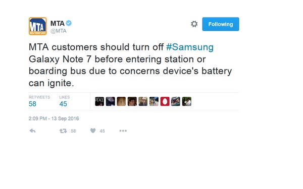 Lệnh cấm này cũng được áp dụng trên hệ thống xe buýt trong thành phố của MTA. Hành khách khi vào trạm của MTA cũng phải hạn chế mở Galaxy Note7 của họ "do lo ngại pin của thiết bị có thể bắt cháy". Ngoài ra, những người sở hữu sản phẩm này cũng không được phép sạc điện thoại trên những chuyến xe của MTA.
