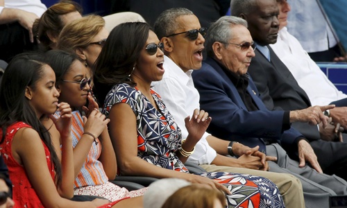 Ông Obama cùng gia đình ngồi xem một trận bóng chày cùng Chủ tịch Cuba Raul Castro tại Havana hồi tháng ba. Ảnh: Reuters.