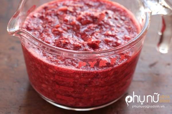 Chanh vắt lấy nước cốt, để sang một bên. Phần vỏ chanh bào nhỏ, lấy phần xanh. Dâu tây xay nhuyễn mịn. Trộn tất cả các nguyên liệu lại với nhau gồm mè rang, nước chanh, vỏ chanh, muối, dâu tây nghiền.