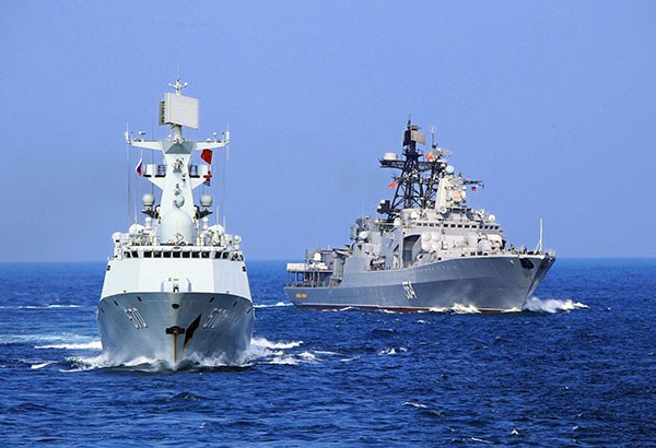Tàu Trung Quốc (trái) và tàu Nga (phải) diễn tập hải quân chung ở Biển Đông ngày 16.9.