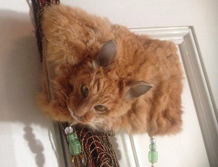 Thật quá tàn nhẫn với chú mèo này khi bị lôi ra làm túi xách một cách tàn nhẫn. Không chỉ bị lấy da làm túi mà ngay chiếc đầu của chú cũng đính luôn trên chiếc túi. Vì là một chiếc túi quá quái dị nên giá bán của nó lên tới hàng nghìn đô.
