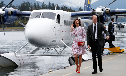 Di chuyển bằng thủy phi cơ, công nương Catherine chọn một bộ váy liền dài tay, kín đáo màu trắng, hoạt tiết đỏ, màu sắc đặc trưng của Canada. Bộ váy trị giá 4.000 bảng (5.000 USD) là một thiết kế của Alexander McQueen, thương hiệu đã tạo ra bộ váy cưới của cô.