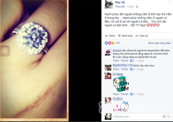 Tối 30/9, Hoa hậu Đông Nam Á 2014 Thu Vũ đã chia sẻ trên trên trang Facebook cá nhân tâm sự đầy ẩn ý: “Hạnh phúc đời người không nằm ở trên tay mà nằm ở trong tim... Hạnh phúc không nằm ở người có tiền, nó chỉ ở lại với người có tâm... Thu chỉ cần người có tâm thôi... hết ?!?.Bye”. Kèm theo đó là hình ảnh bàn tay đeo nhẫn kim cương lấp lánh.