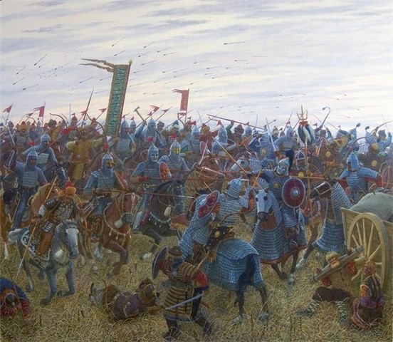 Tranh mô tả trận chiến eo Samara, nơi Thành Cát Tư Hãn được cho là thất bại thảm hại.
