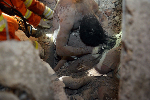 Một nhân viên cứu hộ đã xúc động nói: “Đứa trẻ đã sống được nhờ vào việc cha của cô bé đã dùng chính máu thịt của mình để làm giá đỡ, tạo ra không gian sống cho con gái”.