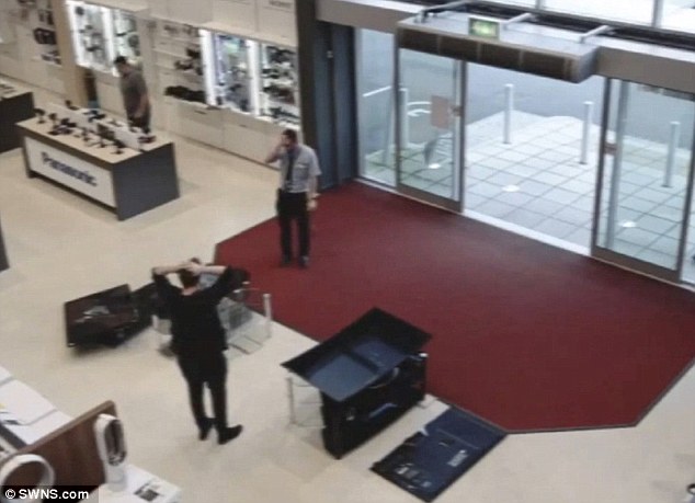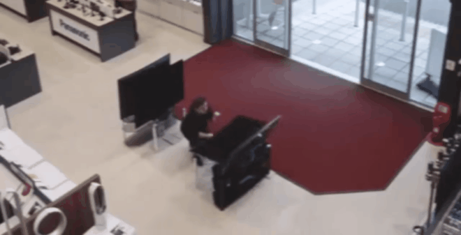 Chàng thanh niên trong khi bước lùi lại va vào chiếc kệ trưng bày phía sau khiến hai chiếc TV nữa đổ nhào trong sự sửng sốt của nhân viên siêu thị.