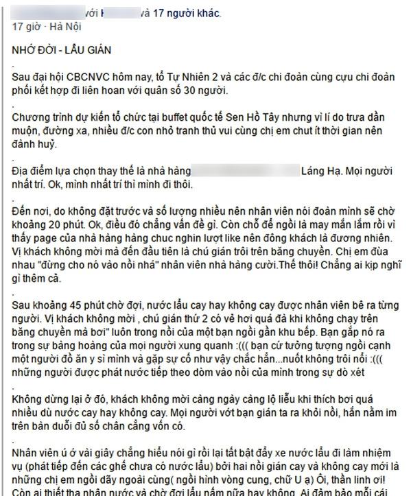 Chị C.H.L viết: “Có ai muốn đi ăn gặp sự vụ như thế để được giảm giá không? Có ai muốn ngồi chờ gần tiếng và giữa trưa nắng lóc cóc dẫn nhau ra đường khi cái bụng sôi ong óc? Có ai muốn được buổi tập trung hiếm hoi lại bị phá vỡ kiểu như thế không? Chốt lại, đoàn em ra về và thanh toán tiền nước uống. Và chắc chắn một điều rằng 30 người hôm nay "tham gia trải nghiệm" ở nhà hàng lẩu nấm sẽ tự hứa với mình dặn dò gia đình, bạn bè, người thân... tránh xa nhà hàng đó! Càng xa càng tốt”.