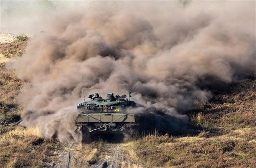Xe tăng chiến đấu chủ lực Leopard 2A6 của Bundeswehr xả khói ngụy trang tại thao trường Munster.