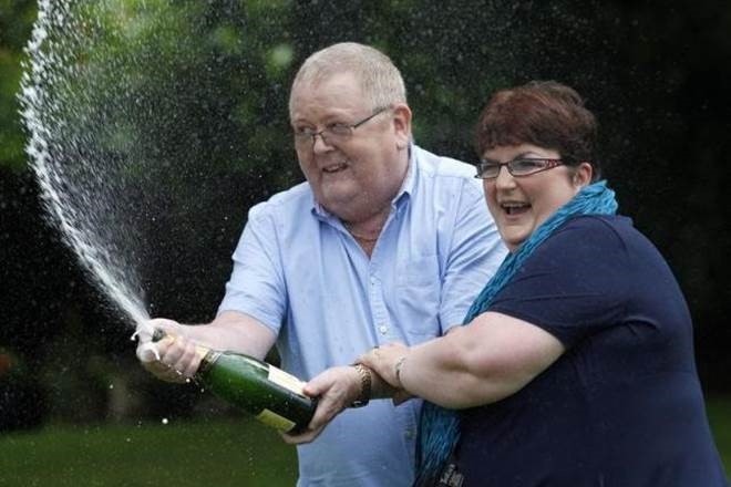 Vợ chồng David và Carol Martin ăn mừng giải thưởng 33 triệu bảng Anh (tương đương 40 triệu USD) hồi đầu năm nay. Ảnh: Reuters.