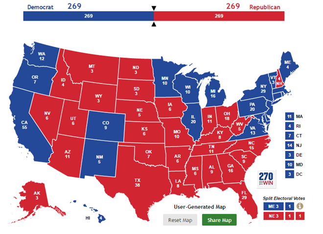Tình thế nan giải của bầu cử tổng thống Mỹ: Ứng viên đảng Cộng hòa và đảng Dân chủ hòa nhau với số phiếu đại cử tri là 269-269. Ảnh: 270 to win.