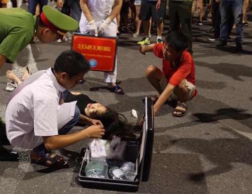 Xác định ban đầu, nạn nhân là nữ, 18 tuổi, có thương tích chảy máu, người co giật, khu vực hiện trường đã được lực lượng 113 Công an Quận Hoàn Kiếm bảo vệ.Cán bộ y tế đã kịp thời được sơ cứu và chuyển nạn nhân vào bệnh viện Việt Đức. Tiên lượng sức khỏe của cô gái đã qua cơn nguy kịch. Nguyên nhân ban đầu xác định là bị ngã đập gáy xuống đường.