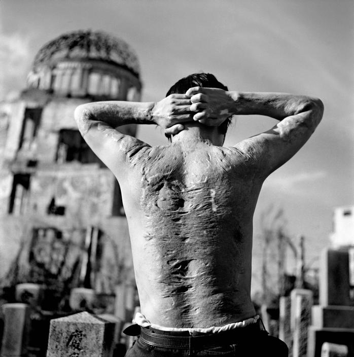 Hình ảnh hiếm về thảm họa bom nguyên tử Hiroshima: những vết bỏng kinh hoàng trên cơ thể một người đàn ông, xung quanh là khung cảnh đổ nát của thành phố.