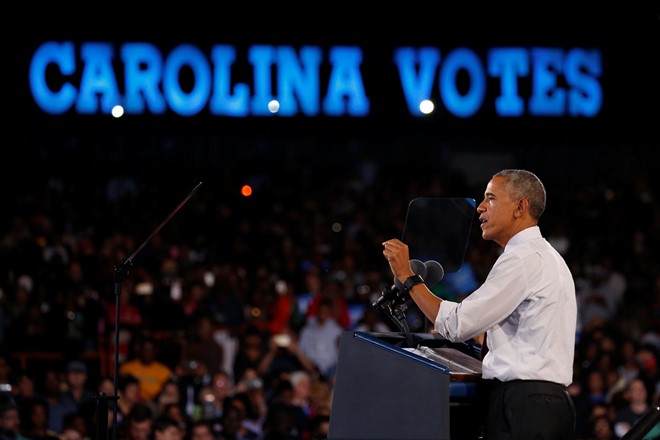 Clinton và "đồng đội" đang dồn lực vào vận động tranh cử ở các bang chiến trường. Trong ảnh là Tổng thống Obama trong buổi vận động tranh cử cho bà Clinton ở bang North Carolina hôm 4/11. Ảnh: Reuters .