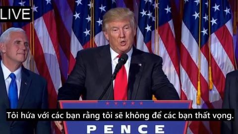"Bây giờ là thời gian để nước Mỹ hàn gắn vết thương chia rẽ, chúng ta phải đoàn kết. Tôi muốn nói với tất cả người đảng Cộng hòa, đảng Dân chủ và độc lập trên khắp đất nước này rằng đã đến lúc chúng ta xích lại gần nhau, như một dân tộc thống nhất", ông phát biểu trong tiếng hô vang "USA".