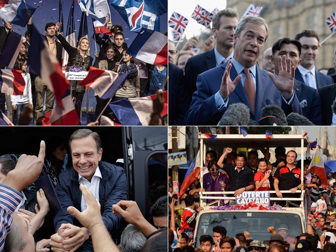 Bà Marine Le Pen, lãnh đạo đảng cực hữu ở Pháp và ông Nigel Farage là người ủng hộ chiến dịch Brexit (hàng trên từ trái sang). Thị trưởng Joao Doria của Brazil và Tổng thống Duterte của Philippines (hàng dưới từ trái sang). Ảnh: AFP
