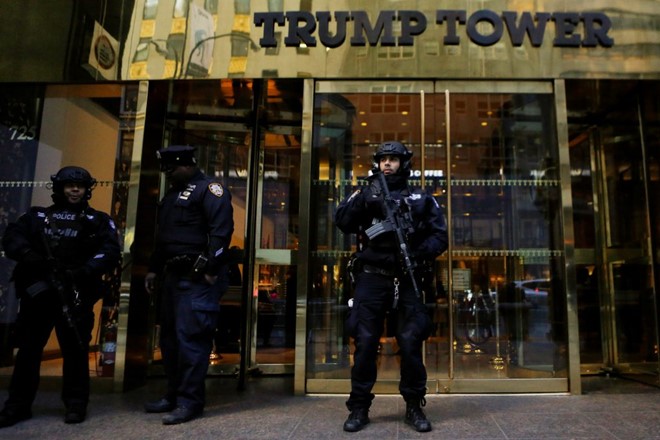 Lực lượng Mật vụ Mỹ canh gác bên ngoài tòa nhà Trump Tower ở New York, nơi tổng thống đắc cử Trump và vợ con sinh sống. Ảnh: Reuters.