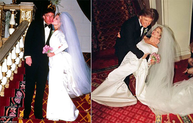 Hai người kết hôn tại Plaza Hotel ở New York ngày 20/12/1993 trong một đám cưới xa hoa với 1.000 khách mời, được 17 kênh truyền hình và 90 phóng viên ảnh tham gia đưa tin. Ông Trump không ngại dốc hầu bao để thiết đãi khách khứa với tiệc cưới gồm số trứng cá muối trị giá 60.000 USD, bên cạnh sushi, cá hun khói, thịt cừu, thịt bò, gà tây. Ảnh: The Life Picture