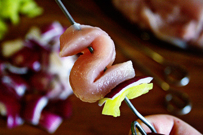 3. Xiên 1 miếng ớt rồi 1 miếng hành tây, xiên dải thịt gà vào xiên theo hình zic zac. Lặp lại một vài lần cho đến khi xiên thịt đạt tới độ dài bạn mong muốn.
