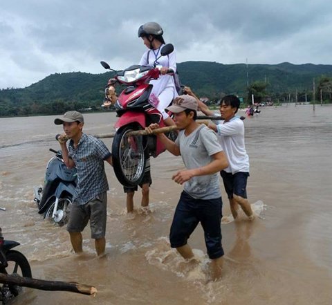 VBF-Khi lũ lụt tràn qua thì hầu hết mọi hình ảnh đẹp ở nơi đó đều bị tàn phá.Thế nhưng trong cơn lũ vừa qua tại Phú Yên thì lại khác hình ảnh những thanh niên dùng gậy gỗ tìm cách khiêng cô gái trẻ qua dòng lũ đã khiến cho người xem quên đi sự ảnh hưởng nặng nề của cơn lũ vẫn còn đang hoành hành tại nơi đây.4 thanh niên dùng 2 thanh gỗ khiêng nữ sinh cùng chiếc xe máy như vác kiệu vượt qua nước lũ tại Phú Yên.