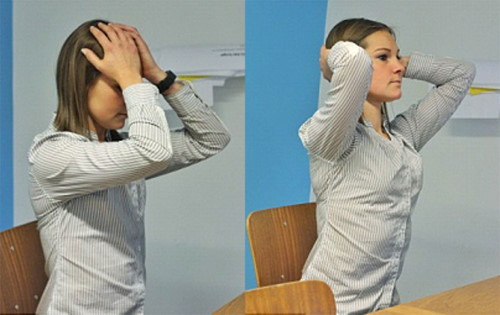 Đây là động tác giúp giảm đau nhức vùng cổ. Đặt 2 bàn tay lên đầu và ấn vào trán đẩy đầu về phía sau, đồng thời dùng cơ cổ đẩy ngược trở lại. Sau đó, đan 2 bàn tay vào nhau và đặt ở sau đầu. Dùng cơ cổ đẩy đầu về phía sau đồng thời sử dụng 2 bàn tay để đẩy ngược trở lại.