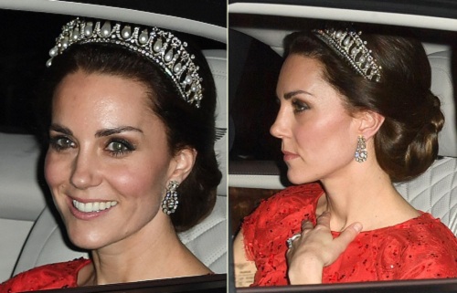 Trong bữa tiệc chiêu đãi ngoại giao ở cung điện Buckingham, công nương Anh đã gây bất ngờ cho mọi người khi đội chiếc vương miện của người mẹ chồng quá cố. Đây là lần thứ 5 công nương đội chiếc vương miện này. Được biết, chiếc vương miện được thiết kế vào năm 1914.