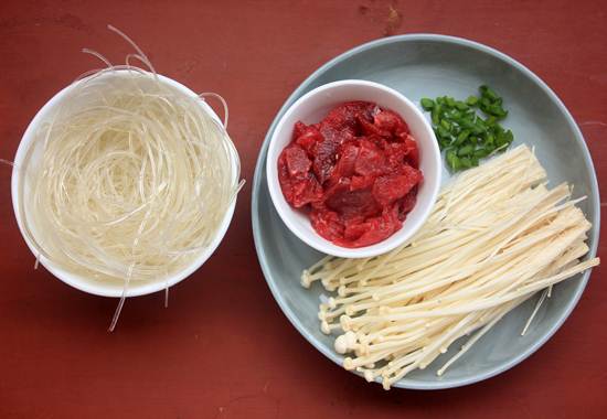 Bước 1: Miến ngâm vào nước cho mềm, bò thái lát mỏng rồi ướp với một ít hạt nêm, bột canh cho thấm ra vị, nấm cắt bỏ chân và tách nấm.