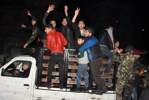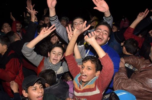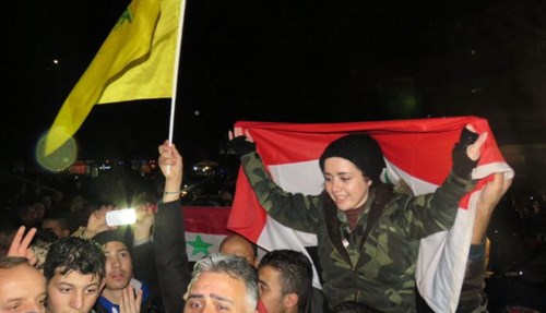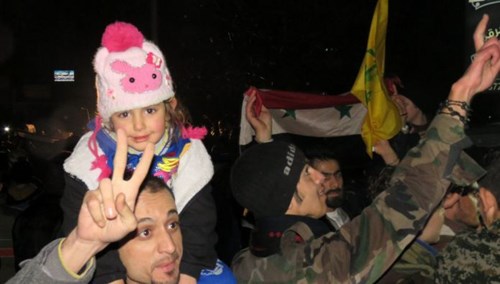 Người dân mang theo cờ in hình Tổng thống Syria Bashar al Assad đổ ra đường mừng chiến thắng.