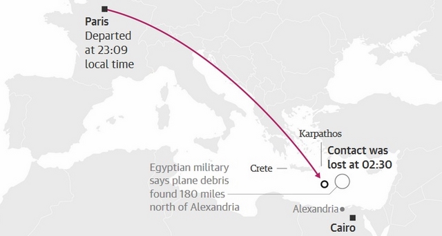Chiếc Airbus 320 chở theo 40 người Ai Cập, 15 người Pháp khi gặp nạn. Báo Ai Cập cho biết chính quyền Cairo đã cung cấp thông tin cho Pháp từ nhiều tháng trước nhưng Paris yêu cầu điều tra thêm.