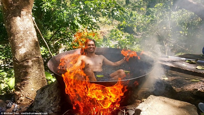 Michael Diez, du khách người Manila (Philippines), đến du lịch ở tỉnh Antique và rất thích thú khi được trải nghiệm dịch vụ tắm nước nóng ngay trong bồn nước trên bếp lửa tại khu du lịch Tibiao thuộc tỉnh này. Ảnh: Michael Diez/Mediadrumword.