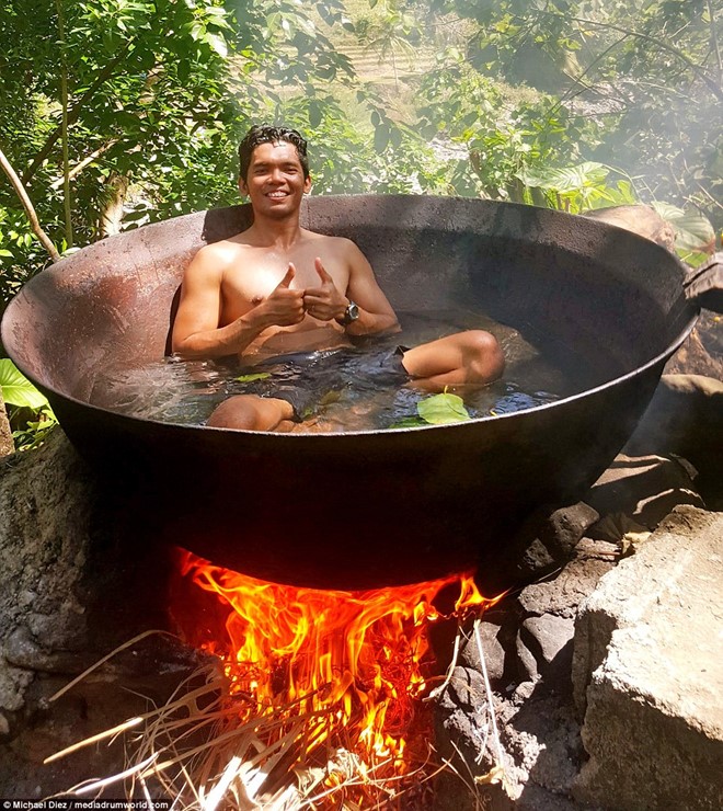 Hiện nay để thu hút khách du lịch, có rất nhiều chiêu để gây ấn tượng. Nếu bạn là người ưa mạo hiểm hãy đến với dịch vụ tắm như thế này tại Philippinnes. Bạn sẽ có những trải nghiệm cực hay: Tắm trong bồn được làm nóng trực tiếp bằng cách đun sôi trên lửa. Đó là một thử thách lòng dũng cảm và là trải nghiệm đang rất hút khách tại một khu nghỉ dưỡng ở Philippines.