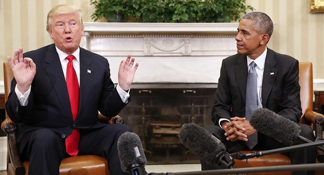 Tổng thống đắc cử Donald Trump gặp gỡ Tổng thống Obama sau khi giành chiến thắng hôm 8/11. Nguồn: AP
