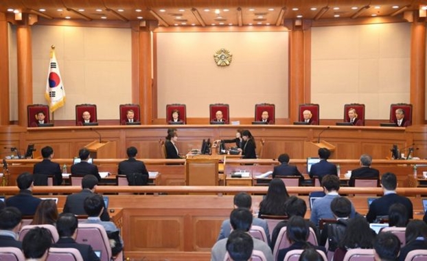 Chín thẩm phán Tòa án Hiến pháp Hàn Quốc trong phiên tranh luận về quyết định luận tội Tổng thống Park Geun-hye ngày 5/1 - Ảnh: Reuters.
