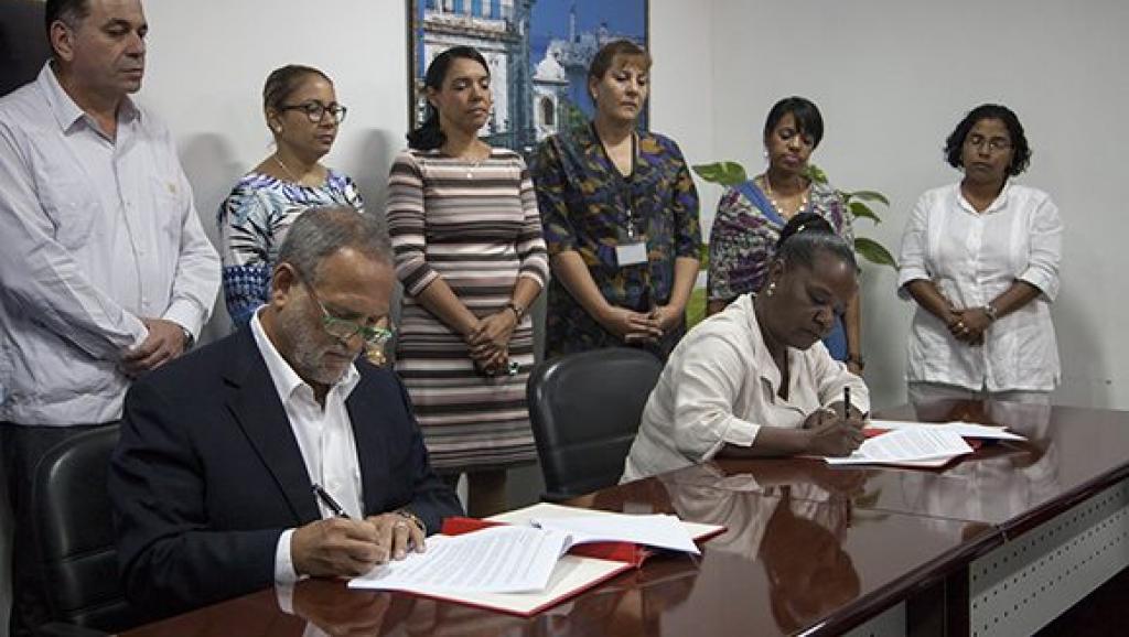Chủ tịch công ty Mỹ Coabana Trading LLC, ông Scott Gilbert và giám đốc công ty xuất khẩu nhà nước Cubaexport, bà Isabel O’Reilly ký kết một thỏa thuận xuất khẩu than Cuba sang Mỹ ngày 5.1.