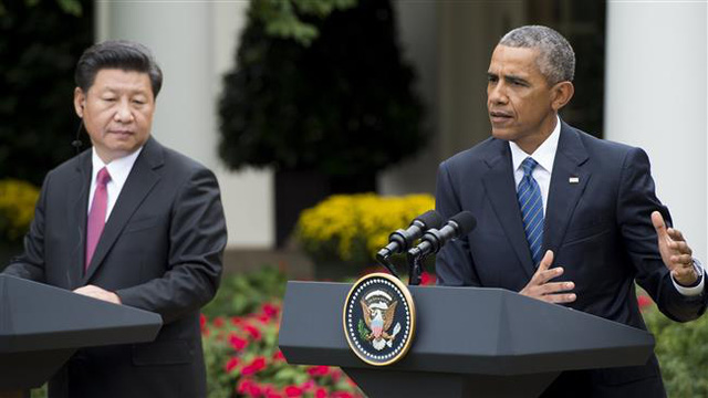 Tổng thống Mỹ Barack Obama và Chủ tịch Trung Quốc Tập Cận Bình tại Vườn Hồng, Nhà Trắng hồi ngày 25/9/2015. Ảnh: AFP