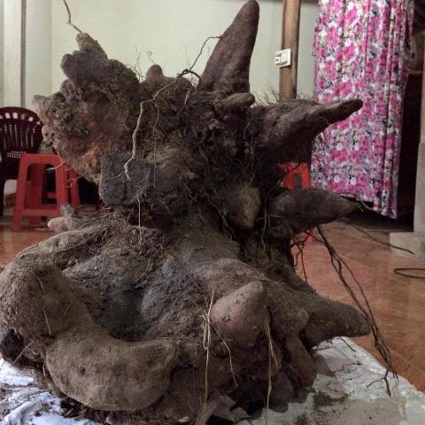 Sau khi đào lên, ông Bắc phải gọi 4 người dân đến khiêng lên sân nhà. Khi cân lên củ khoai nặng hơn 73 kg, theo quan sát củ khoai có rất nhiều nhánh, hình thù kỳ lạ.