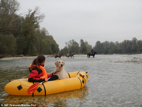 Marina cùng cún cưng chèo thuyền trên sông Brenta ở Italia. Để thực hiện chuyến phiêu lưu dài ngày, cô gái 25 tuổi đã quyết định bỏ công việc văn phòng ổn định và có mức thu nhập hấp dẫn.
