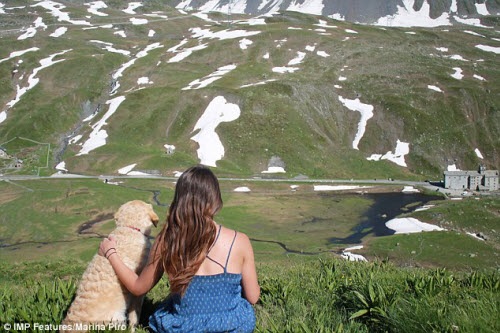 Cô gái trẻ cùng cún cưng của mình ngồi ngắm cảnh dãy núi Alops ở Pháp. Trong 11 tháng qua, Marina đã tham quan nhiều hồ ở Pháp, khám phá Italia và tận hưởng những bờ biển đẹp ở Anh.