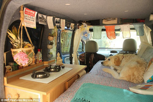 Cận cảnh bên trong căn nhà di động của Marina với đầy đủ tiện nghi cần thiết dành cho cô và chú chó cưng.