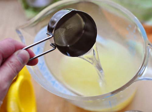 - Cho muối, nước cốt chanh vào 400ml nước lọc, khuấy đều đến khi thu được hỗn hợp đồng nhất.