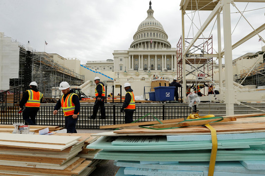 Các công nhân xây dựng những bục đứng tại tòa quốc hội. Ảnh: REUTERS
