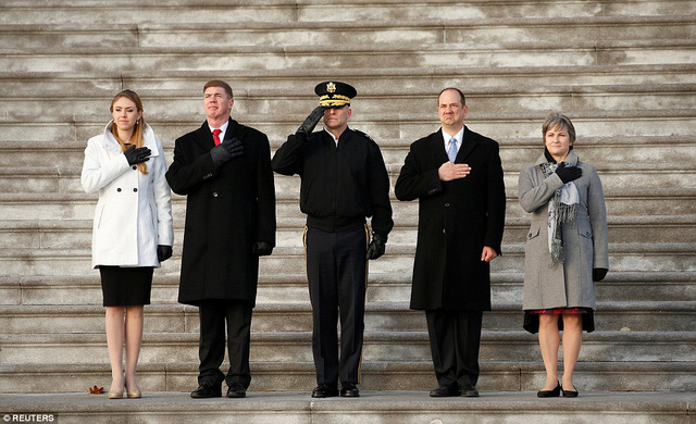 Bốn người, cùng Thiếu tướng Bradley Becker đi giữa hai cặp đôi, bước xuống những bậc thang ở khu East Front của Điện Capitol. Sau đó họ dừng lại, đặt tay lên ngực trái và hát quốc ca. Đây cũng chính là kịch bản mà vợ chồng Tổng thống và Phó Tổng thống tân cử sẽ thực hiện trong lễ nhậm chức chính thức ngày 20/1 tới.