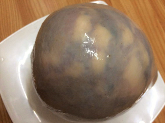 - Sau đó lấy thịt ra khỏi tủ lạnh, đeo bao tay bốc từng nhúm hỗn hợp thịt dồn vào bong bóng heo. Vì bong bóng dai và rất dãn nở nên cứ dồn và ém cho thịt đều, đến khi đầy lấy kim chỉ may khâu lại. Dùng tăm xăm nhiều lỗ vào khối bong bóng cho nước rỏ bớt ra ngoài.