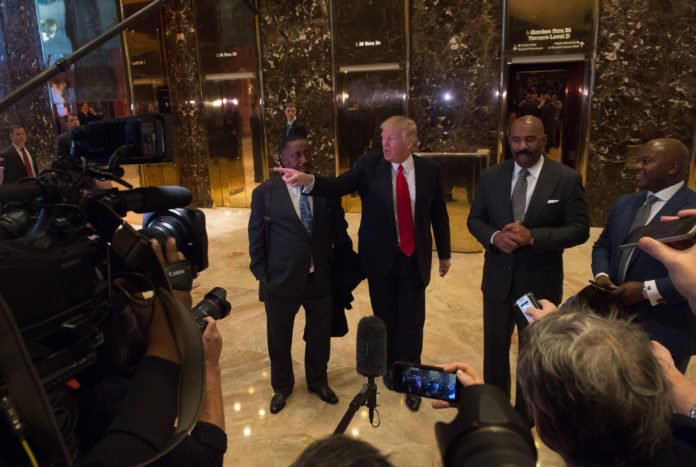 Tổng Thống Tân Cử Donald Trump và nhà báo Steve Harvey nói chuyện với truyền thông tại Trump Tower - New York ngày 13 Tháng Giêng, 2017 (Hình: BRYAN R. SMITH/AFP/Getty Images)