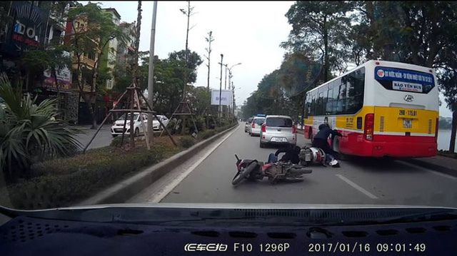 Không dừng ở đó, vụ va chạm đã khiến nam thanh niên đi Honda Lead bị giật mình và bóp phanh gấp. Chiếc Honda Lead đổ ra đường trong khi nam thanh niên điều khiển chống tay vào sườn xe buýt chạy cùng chiều. Thậm chí, nam thanh niên này còn bị kéo lê theo xe buýt một đoạn ngắn.