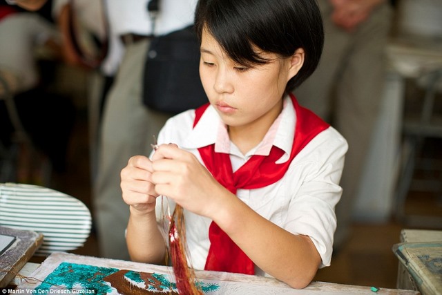 Nữ học sinh tại thủ đô Bình Nhưỡng chăm chú thực hiện tác phẩm thêu.