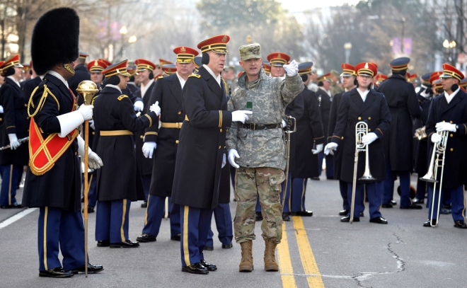 Ban nhạc quân đội Mỹ luyện tập cho lễ diễu hành dọc đại lộ Pennsylvania mà ông Trump sẽ tham gia để di chuyển về Nhà Trắng sau khi tuyên thệ.