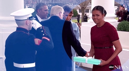 VBF-Clip ghi lại hình ảnh vợ chồng ông Trump xuống xe và gặp mặt vợ chồng ông Obama khi chuẩn bị vào Nhà Trắng. Đáng chú ý lại chính là ở việc bà Michelle Obama được bà Melania Trump tặng 1 hộp quà màu xanh, nhưng thay vì vui vẻ 1 cách tự nhiên thì bà Michelle Obama lại rỏ ra khá gượng gạo khi nhận món quà này.