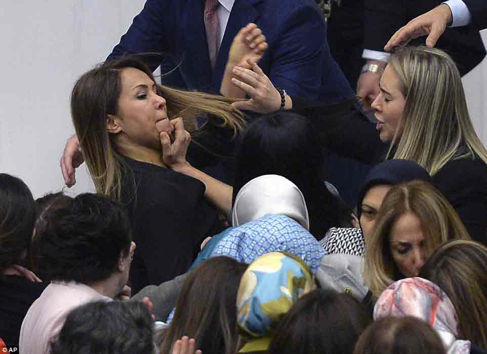 Các nhà lập pháp nhanh chóng lao vào xô đẩy, cào cấu, giật tóc nhau. Phó chủ tịch quốc hội Pervin Buldan, nghị sĩ thuộc đảng Dân chủ Nhân dân của người Kurd (HDP), đã được đưa tới bệnh viện sau khi bị đá vào ngực.